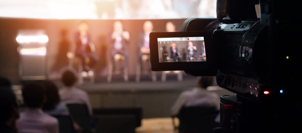 Video Presentation media and live streaming record and broadcast in real time for social network concept. VDO camera taking live video streaming at seminar technology event with flare light effect.